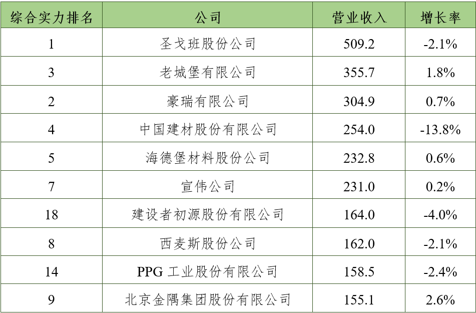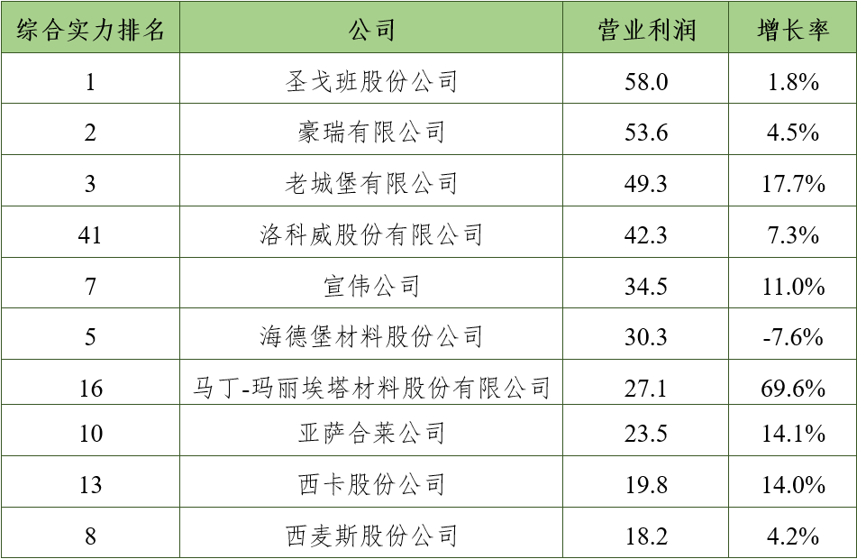 圣戈班股份公司(法国)连续三年位居综合实力第一名,营运利润率和现金流创造新纪录,并通过收购业务,不断扩大在化学建材领域的份额;豪瑞有限公司(瑞士)稳居第二名,流动资产略有下降,其余指标均有不同程度的增长;老城堡有限公司(爱尔兰)营业利润继续保持增长态势,排在第三名;中国建材股份有限公司营业收入和营业利润降低,排在第四名; 海德堡材料股份公司(德国)营业利润小幅下降,其余指标略有增长,排在第五名。亚萨合莱公司(瑞典)营业收入和利润率均达到了两位数的增长,首次跻身前十。