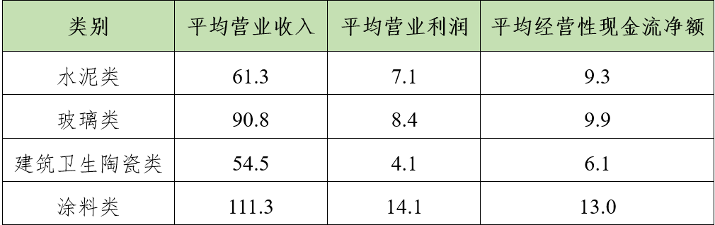 水泥类和玻璃类公司平均营业利润基本与上一年度持平。建筑卫生陶瓷类公司各项指标均出现不同程度下滑。涂料类公司平均营业收入、平均营业利润表现良好。各类公司平均经营性现金流净额均有不同幅度减少。