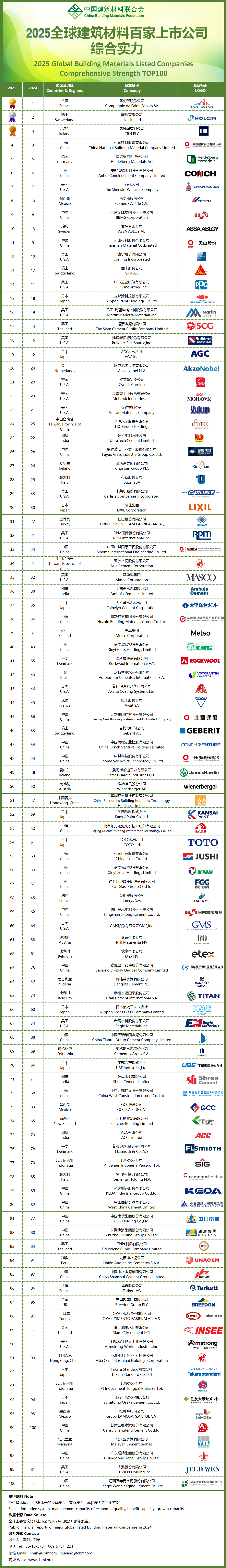 《2025全球建筑材料百家上市公司综合实力》采用建材企业高质量发展评价体系,通过对上市公司2024年表现进行评价来衡量企业综合实力,引导建材企业在发展道路上追求多维度综合实力的做强做优,而不是单一维度的做大。