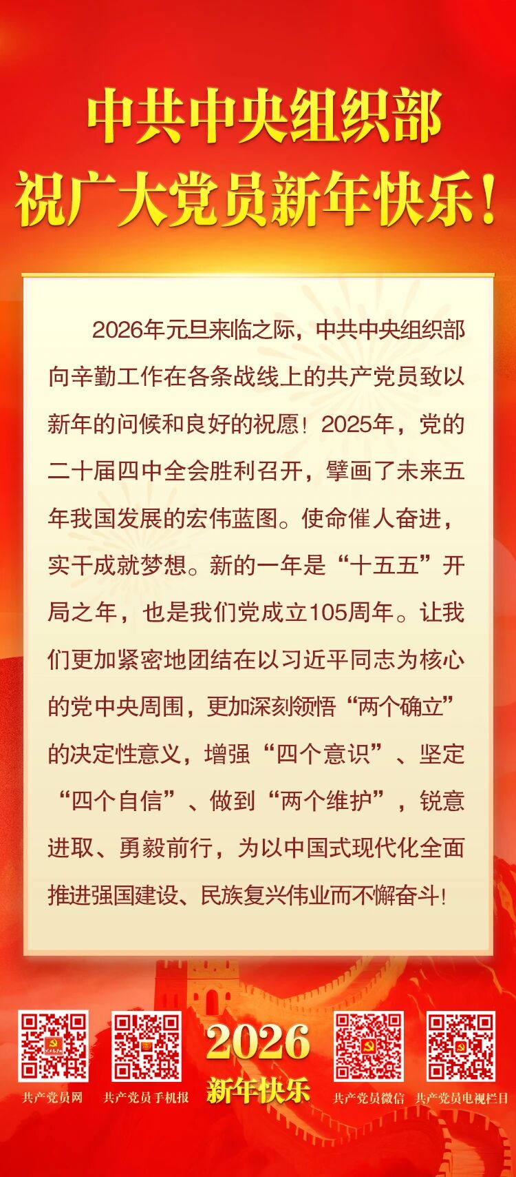中共中央组织部祝广大党员新年快乐!