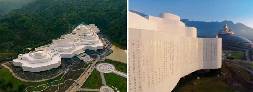 图3-15是奉化弥勒文化博物馆,位于中国佛教五大名山之一——弥勒道场(宁波市雪窦山),由原中央美院、中国美院院长潘公凯大师设计。弥勒文化博物馆外立面设计独具匠心,洁白无瑕的外立面上镌刻了两部金色的佛教经典《金刚经》和《上生经》,经文选用《弥勒上生经》和苏轼手抄版《金刚经》。为准确体现大师的设计意图,浙江宏日泰耐克公司组织科研团队开展技术攻关,向大师展示了由泰耐克白色UHPC打造,集高强、超大、超薄、多纹理、内嵌文字等复杂工艺于一体的新型幕墙产品,赢得了大师的共鸣,成为不二的选择。博物馆外立面的单曲面异形挂板共计20,611m2,由4,708块面板组成,其中589块为1.985mx9.5m大板块,厚度仅30~35mm。大板色泽光亮、质地坚硬并刻有金色经文,组成经书卷轴样式,整体犹如洁白的美玉,使整个建筑成为佛教经典。