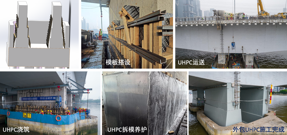 华南大桥主桥建成至今已有20余年,期间进行了多次检测、荷载试验和维修加固。由于下部墩身结构开裂现象持续恶化,理论分析表明承载能力不足, 2023年8月~2024年4月对主桥2、3号墩进行了维修加固。加固方案为:2、3 墩外肢采用型钢组合结构并外包UHPC加固,补强外肢墩柱承载力;对2、3号墩内肢采用钢箍加固限制裂缝开展,并外包UHPC增大截面加固;对承台采用型钢组合结构加固并在顶面加10cm厚UHPC对混凝土适当加强,UHPC施工过程见图3-20,由广东冠生土木施工完成。对UHPC的性能要求为:抗压强度≥120MPa,抗拉强度≥7MPa,弹性模量≤45GPa,28d收缩率<250×10-6,初始坍落扩展度≥700mm。针对该项目湖南固力工程新材料公司研发的微膨胀UHPC,避免了收缩裂缝的产生,UHPC常温无蒸养条件下养护效果良好,减少施工工序,显著提升了薄壁墩加固品质,同时降低施工成本。