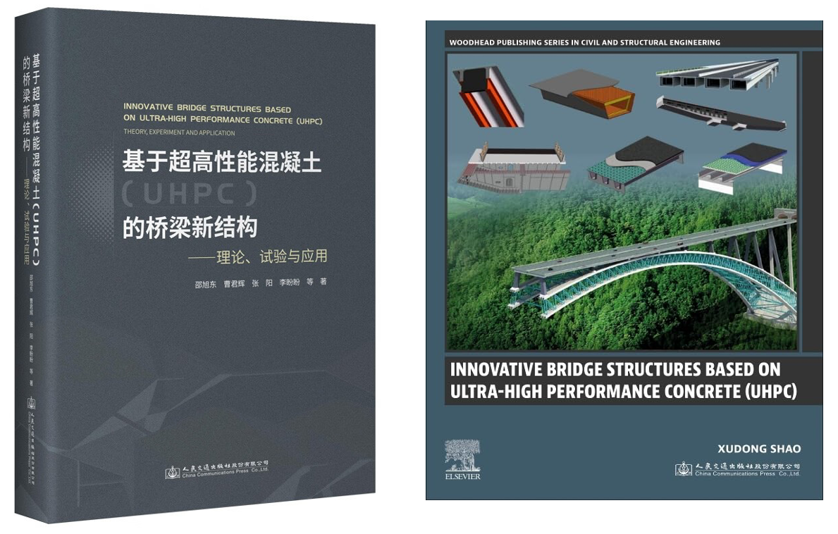 湖南大学邵旭东教授主编的中文版《基于超高性能混凝土(UHPC)的桥梁新结构》图书在2022年12月出版;英文版《Innovative Bridge Structures Based on Ultra-High Performance Concrete (UHPC)》在2024年1月由Elsevier出版集团和人民交通出版社共同出版。该书“详细介绍了作者团队研发的系列UHPC新结构以及在不同类型桥梁?程中的应?实例,反映了从新材料到新结构、新理论、新?法、新标准等全链条创新研究成果。主要内容包括超?性能混凝?(UHPC)介绍、UHPC桥梁设计?法、在役开裂钢桥?的加固改造、UHPC桥?板结构、?跨径单向预应?UHPC箱梁桥、中?跨径装配式梁桥、特?跨径拱桥新体系探索、UHPC加固混凝?桥?、钢 —混组合梁负弯矩区UHPC接缝、UHPC重?式灌浆接头、伸缩装置UHPC锚固技术等“(引自陈政清院士为该书写的序)。