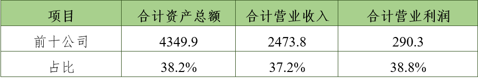 与2024年前十名公司相比,本次前十名公司的合计资产总额减少1.8%,合计营业收入减少5.3%,合计营业利润增加3.0%。前十名公司的合计资产总额、合计营业收入在百家公司总额中的占比分别减少1.5个百分点和0.9个百分点,合计营业利润占比则增加2.1个百分点。头部企业保持了较强的盈利能力。